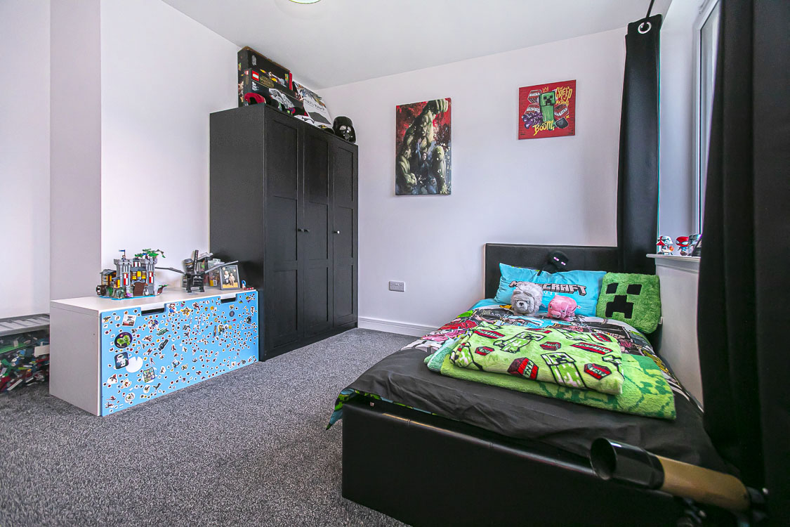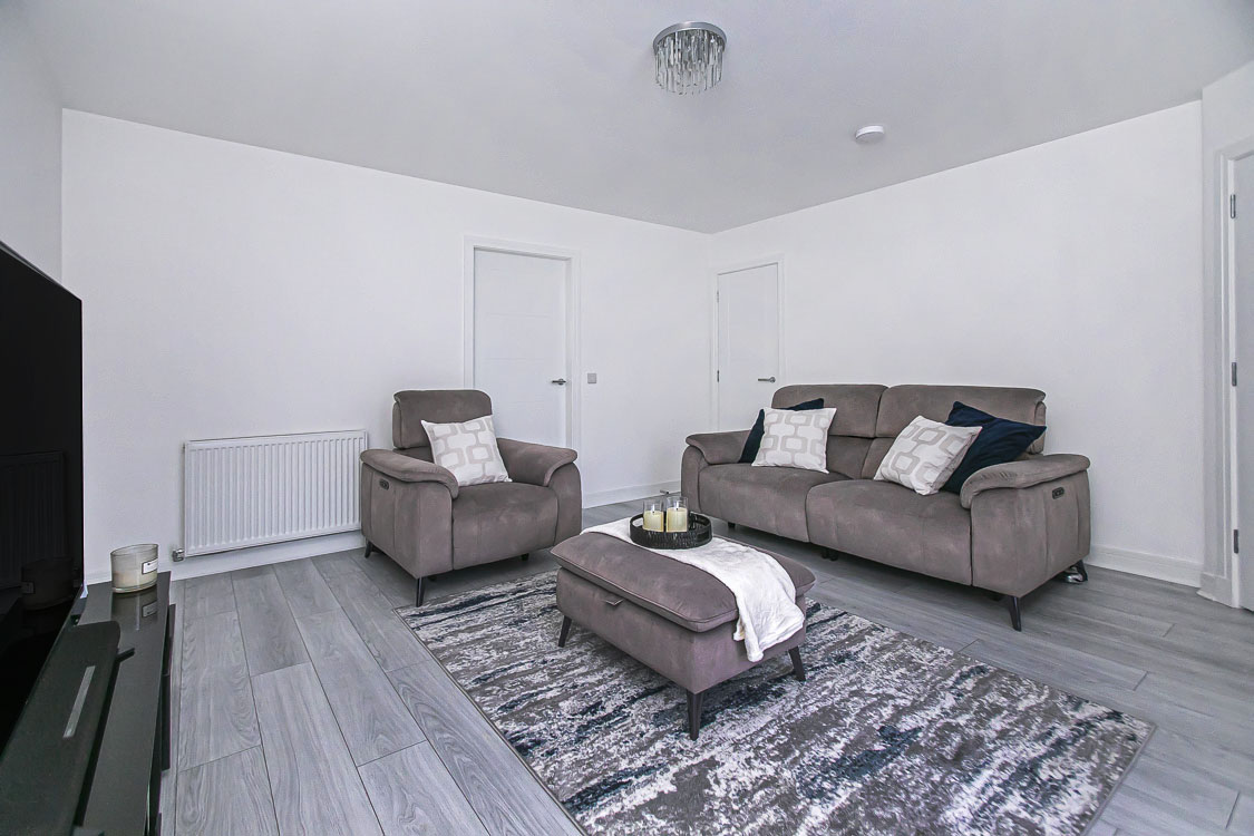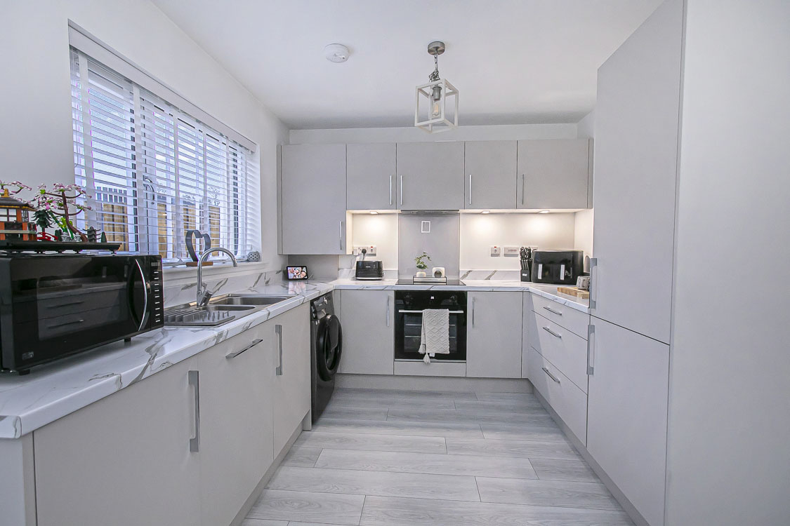 Upstairs, the primary bedroom sits to the front and benefits from fitted wardrobes and a stylish en-suite shower-room. 2 further charming bedrooms and a bright family bathroom (featuring Roca sanitary ware and Porcelanosa tiling) complete this well‑balanced upper floor.
