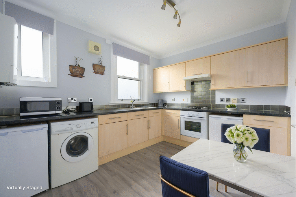 The accommodation is bright and inviting throughout, comprising a spacious, airy lounge perfect for relaxation and entertaining. The impressive modern breakfasting kitchen is a standout feature: well‑equipped with an array of integrated and freestanding appliances, excellent storage, and ample room for breakfasting furniture.