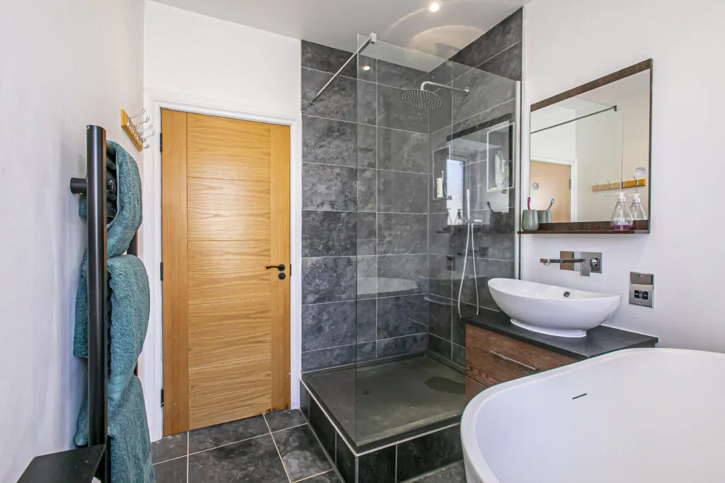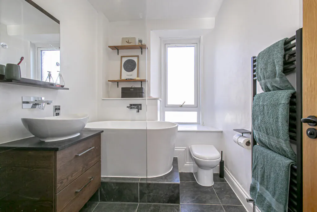 To the rear of the lower level is a large, versatile room currently utilised as a bright second lounge, though it would equally serve as a spacious bedroom depending on preference. The ground floor is completed by a luxurious boutique-style bathroom featuring a freestanding rolltop bath, attractive vanity unit, heated towel rail, and a generous shower enclosure with rainfall shower and handheld spray.