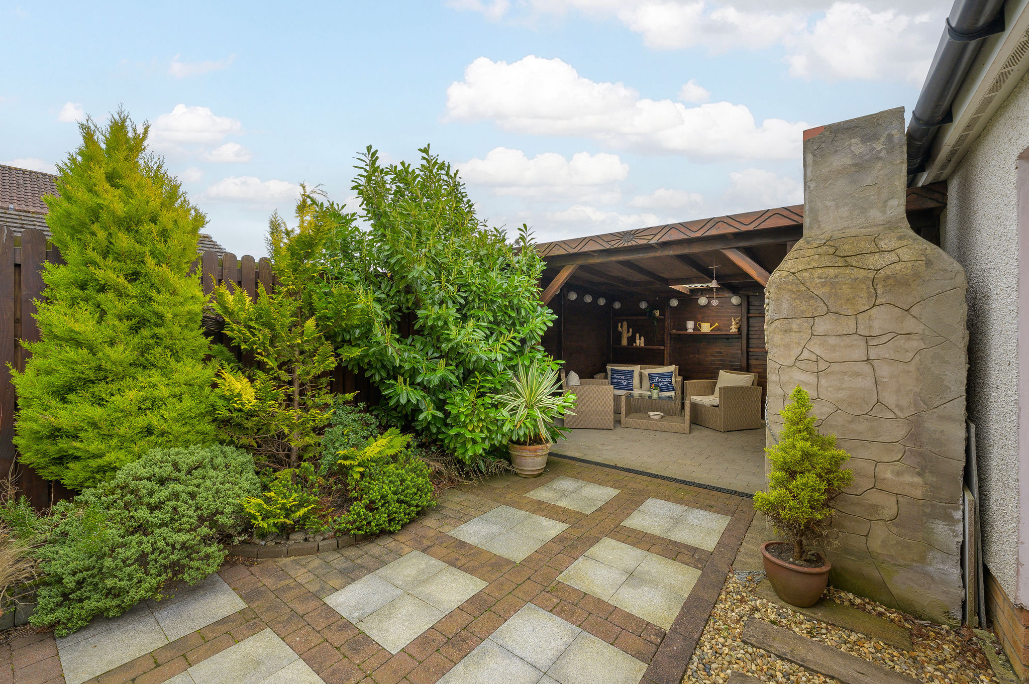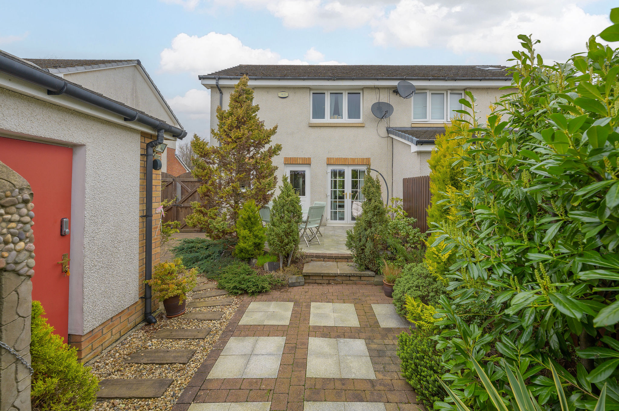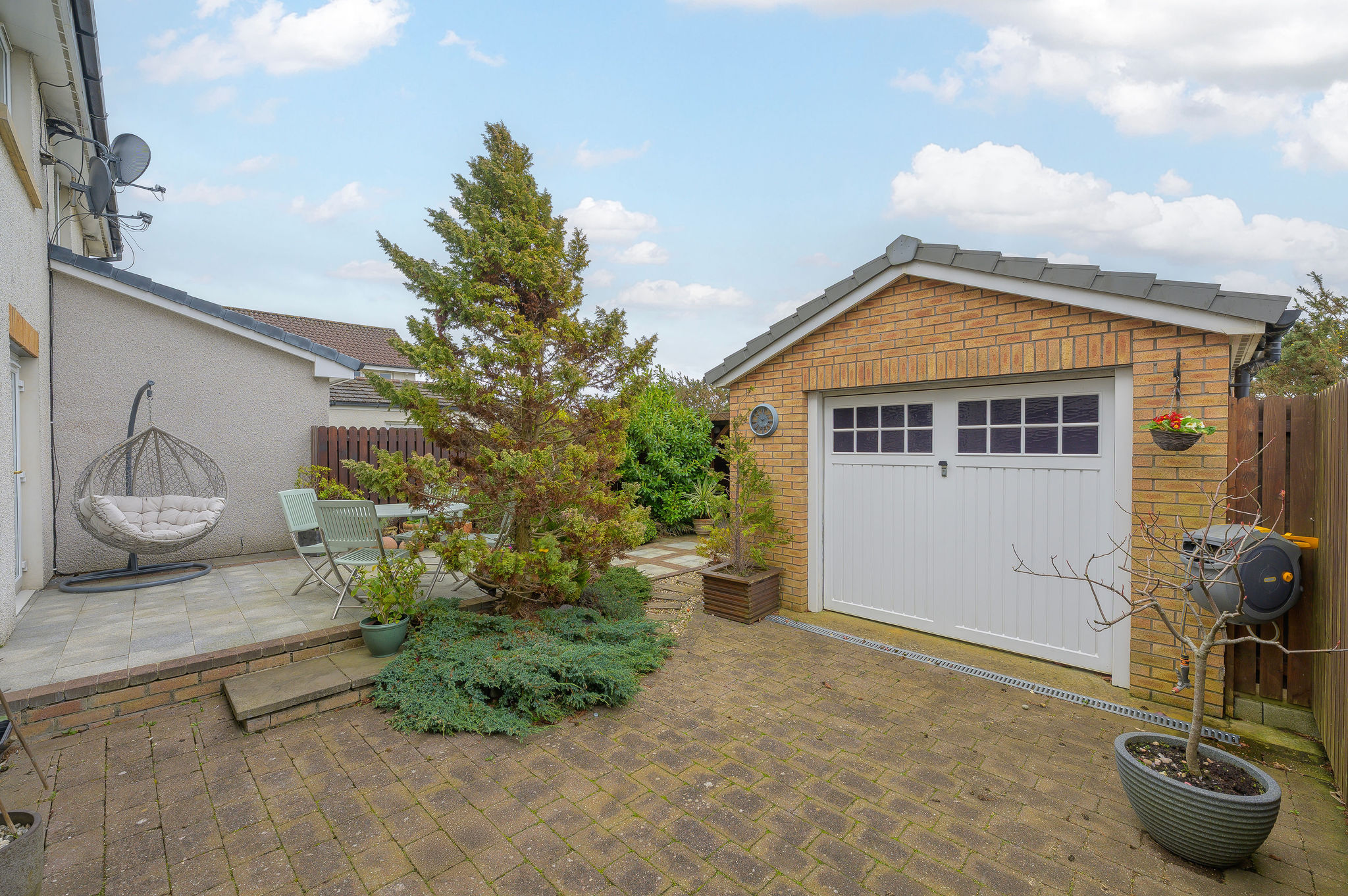 Externally, the rear garden is a true haven: private, sunny, enclosed, and beautifully presented, as well as boasting the covered pergola area which is ideal for outdoor entertaining on a Scottish summer evening. The detached garage provides additional storage or parking options and is accessed via the driveway and wooden gates at the side of the house.