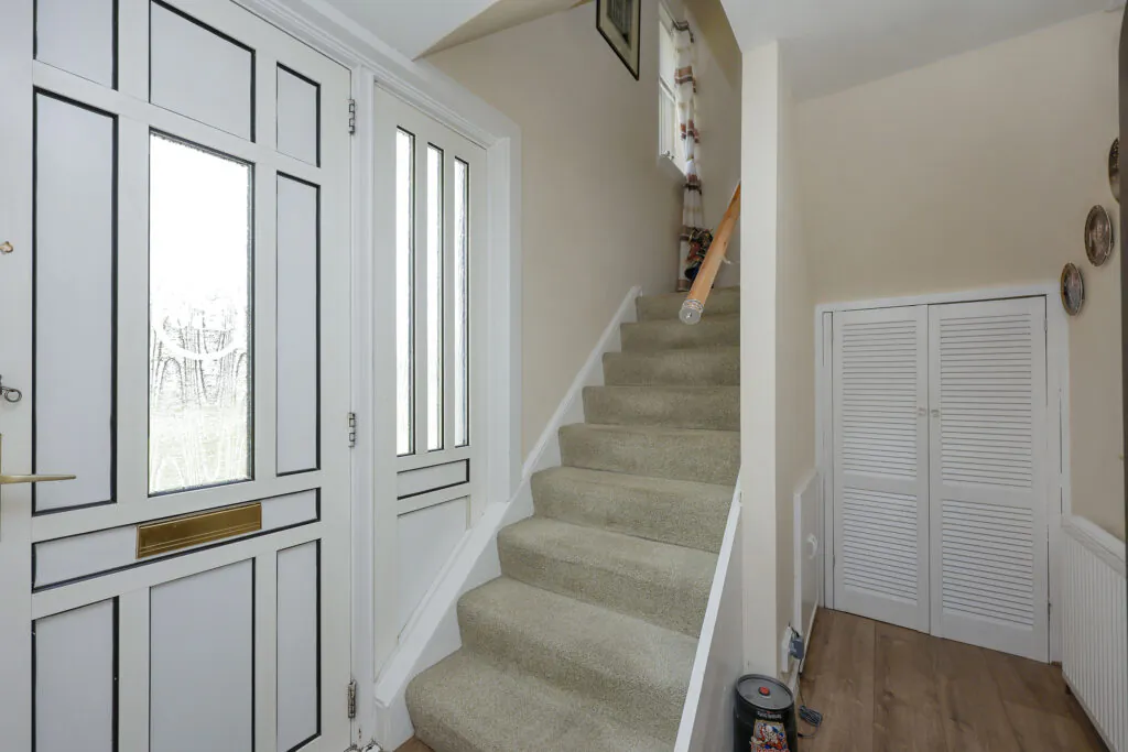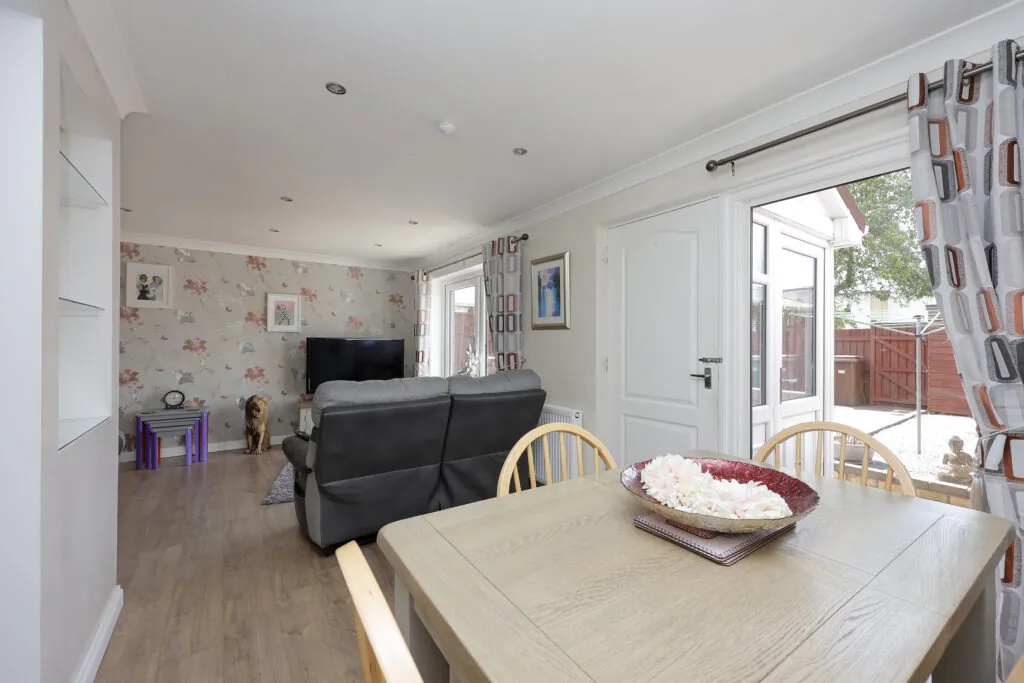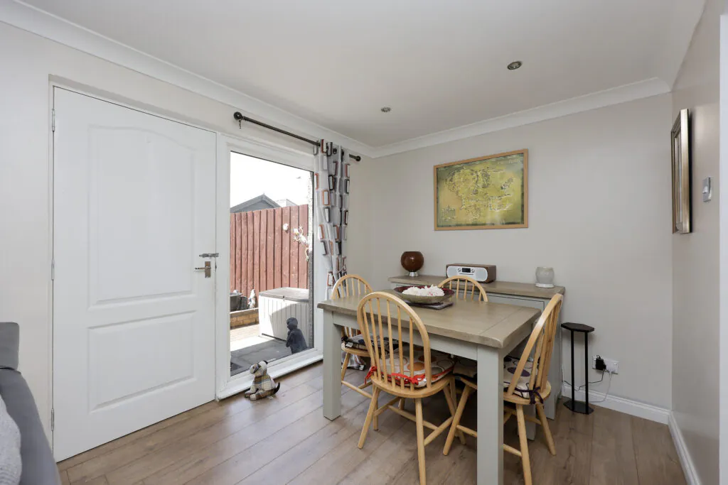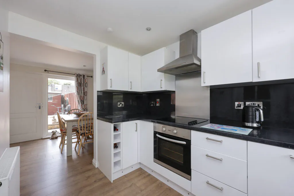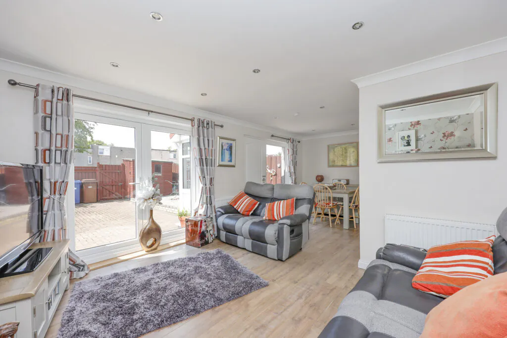 The property boasts excellent accommodation including a recently installed entrance porch, spacious and bright lounge / dining room which is open plan onto the stunning, contemporary kitchen with appliances. There are French doors opening onto the enclosed back garden and the entire area is flooded with natural light. Moving on to the upper level, you will be impressed with the 2 good-sized double bedrooms with plenty of storage space, plus lots of room for free-standing furniture. Accommodation is completed with a lovely, contemporary tiled family bathroom with overhead shower. This lovely family home also benefits from uPVC Double Glazing and Gas Central Heating. Outside, you will be impressed with the sunny, enclosed back garden and a door in the hallway opens to the front of the house which leads to a greenbelt area which sets the house back from the road. There is plenty off-street parking to the rear.
