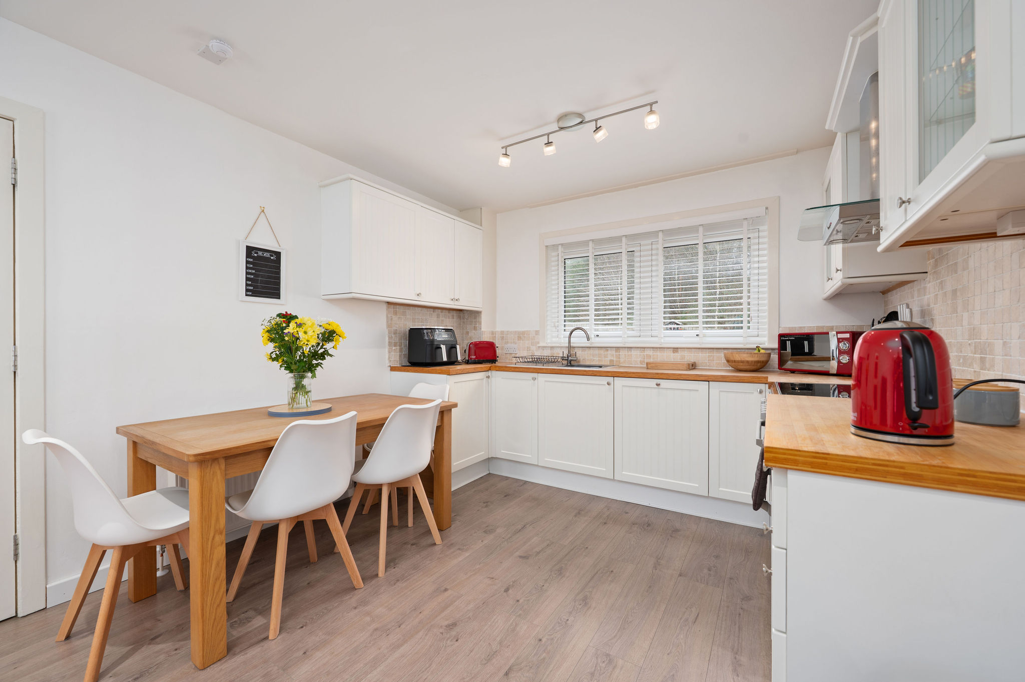 Inside, the home features a bright and airy open‑plan lounge, dining, and kitchen area, beautifully arranged for modern living. This space is flooded with natural light thanks to its dual‑aspect windows, creating an inviting setting for everyday family life or entertaining. The contemporary kitchen is fitted with an impressive range of modern units and appliances, while a separate utility room provides valuable additional storage and direct access to the rear garden.