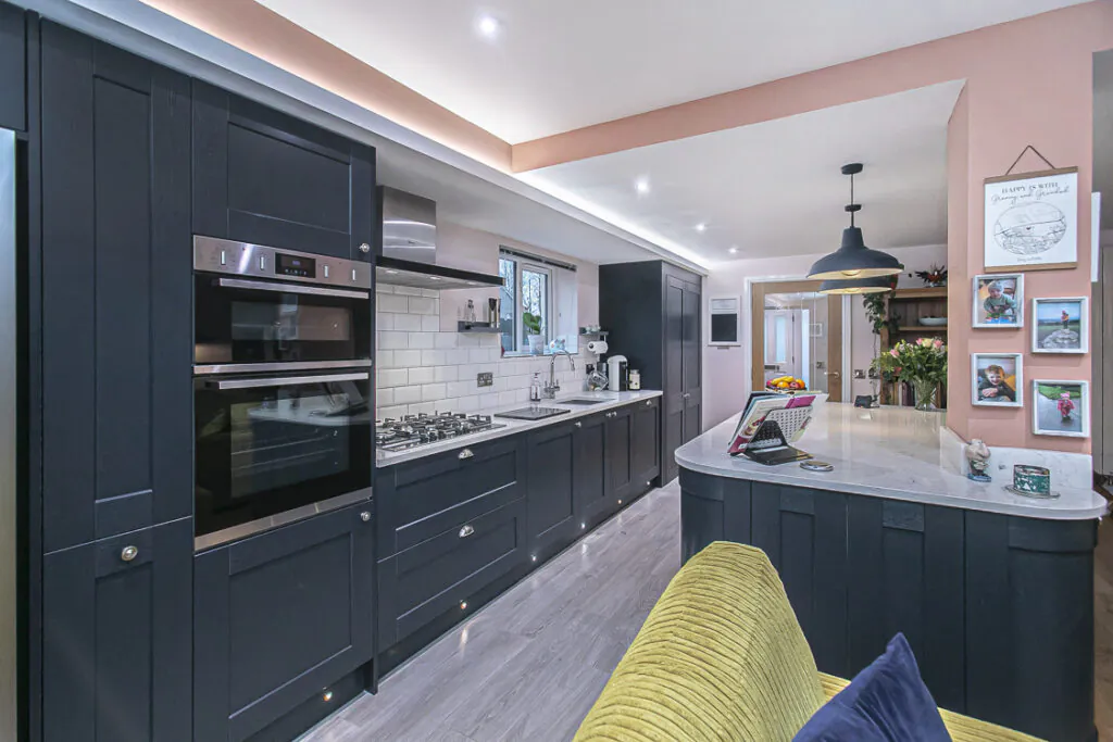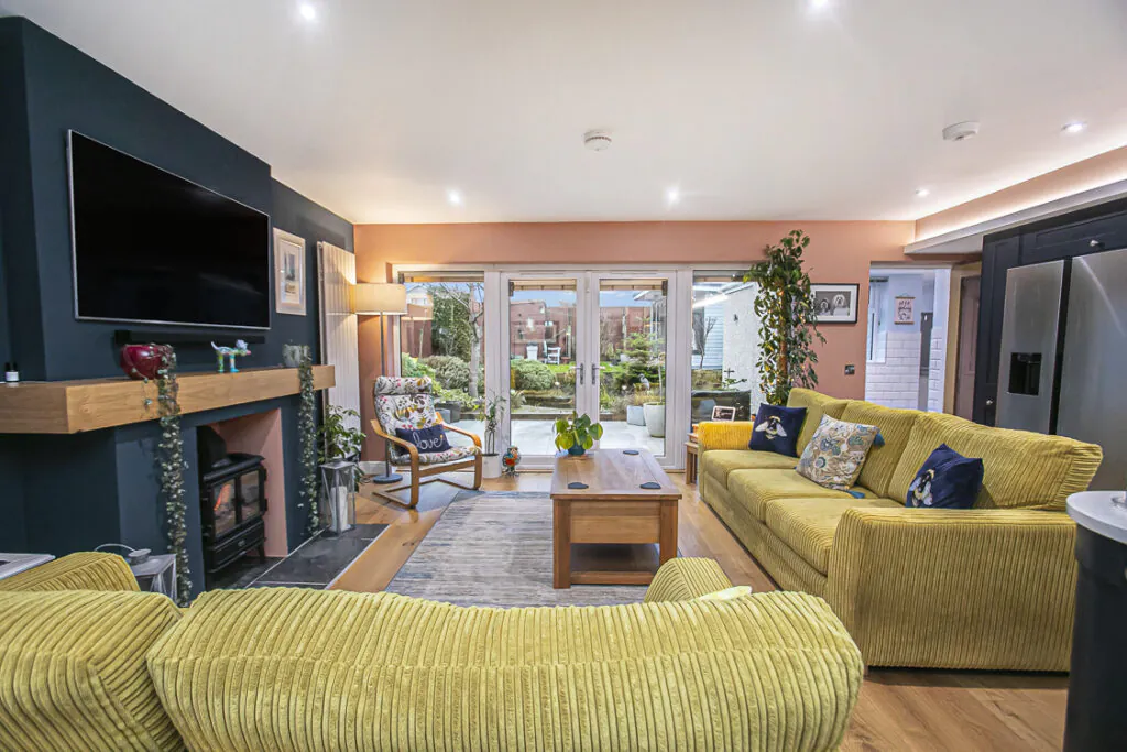 Inside, the home boasts spacious open-plan living, designed for both comfort and versatility. The heart of the home is the outstanding luxury social living / dining / kitchen, complete with luxury fitted kitchen with high-end appliances, stylish worktops, large breakfast bar area, lots of family sized dining/living space with French doors opening directly onto the garden—perfect for indoor-outdoor living.