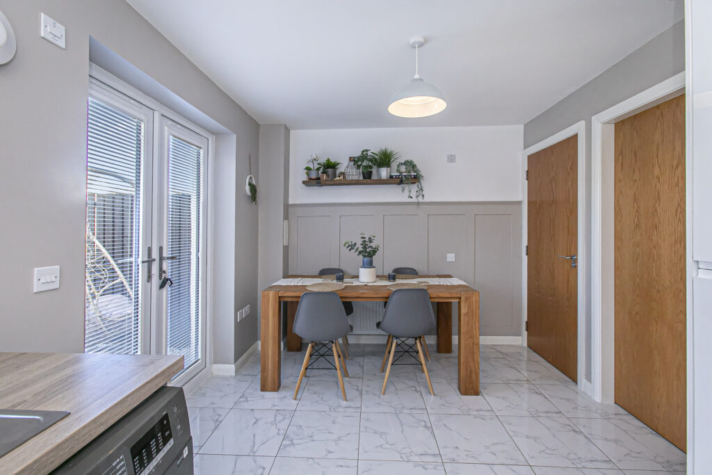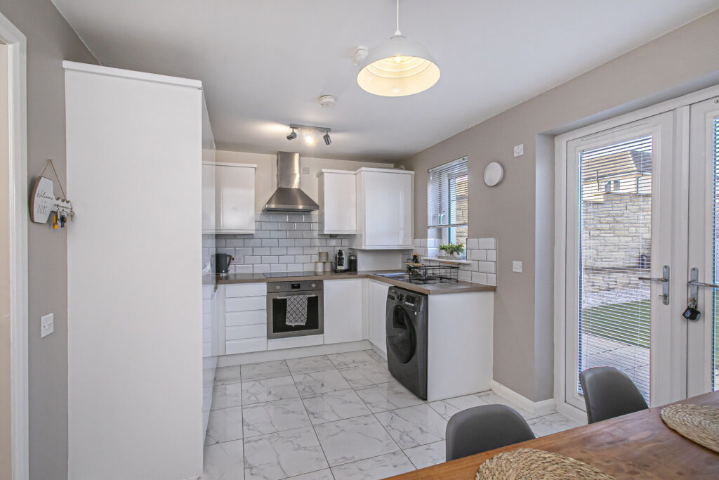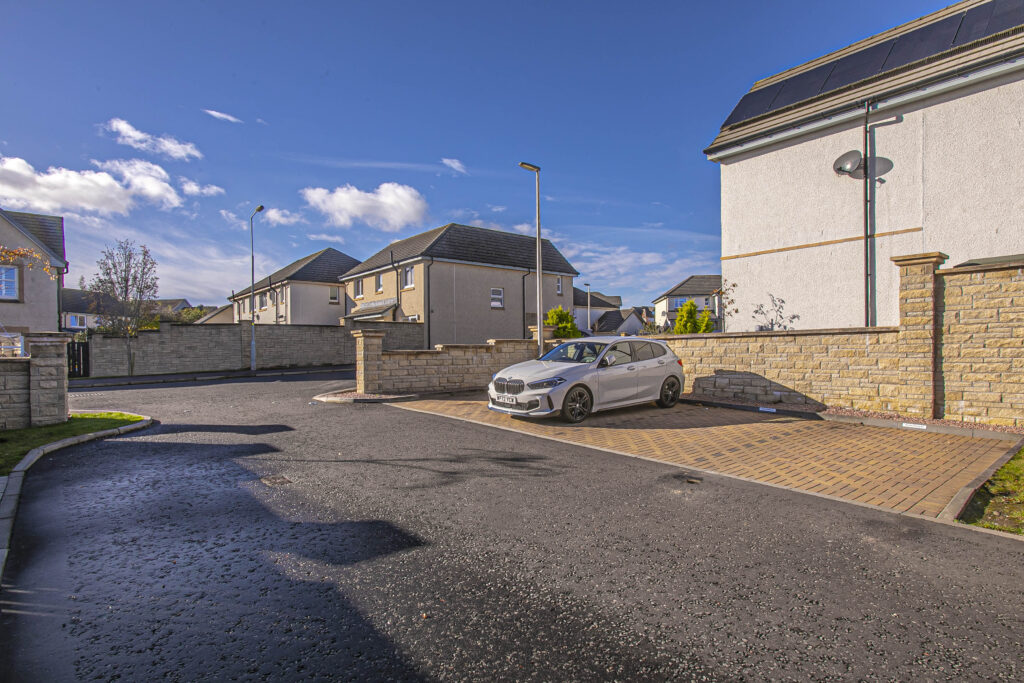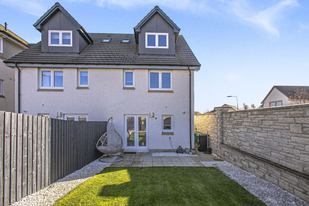 Internal spacious and welcoming accommodation is bright and airy and set over 3 generous floors. This is an Elliot-style family home which was built by Dundas Homes approximately 5 years ago and will impress the most discerning viewer. The ground floor level features a spacious, bright and airy lounge overlooking the front garden and commanding fabulous views across the estate greenbelt area. The modern dining kitchen enjoys French doors which open onto the private back garden and features an array of good quality units with integrated appliances and dining area with plenty space for free-standing dining furniture. The lower level of the house is completed with a handy modern WC /cloaks. Moving on to the first level, you will find 2 spacious double bedrooms with fitted wardrobes and plenty of floorspace for free-standing furniture. The level also features a lovely, modern family bathroom. The top level of this wonderful house features a fabulous large primary bedroom with fitted wardrobes, a recessed bay window area and a stunning, large and contemporary shower-room with large cubicle, beautiful tiling and overhead rainfall shower and handheld spray. As would be expected, this pristine family house benefits from gas central heating, uPVC double glazing and it also enjoys plenty of storage space. The landscaped, fenced and sunny back garden features a patio area and there is, of course, a gate to the rear parking area where you will find allocated and visitor parking spaces, as well as additional visitor parking. There is also a parking bay to the side. There is a small, attractive walled and fenced front garden which overlooks a beautiful, open greenbelt area.