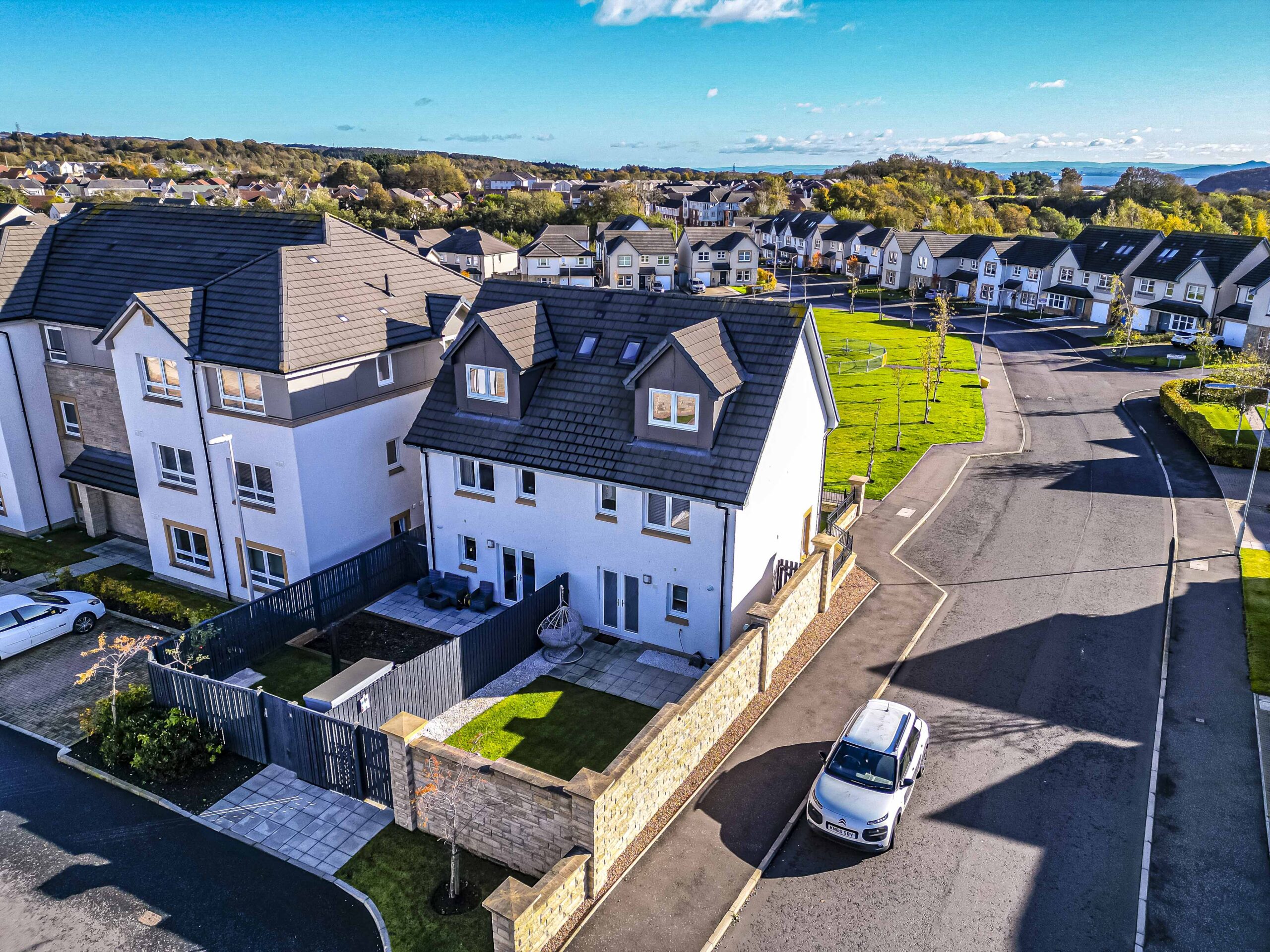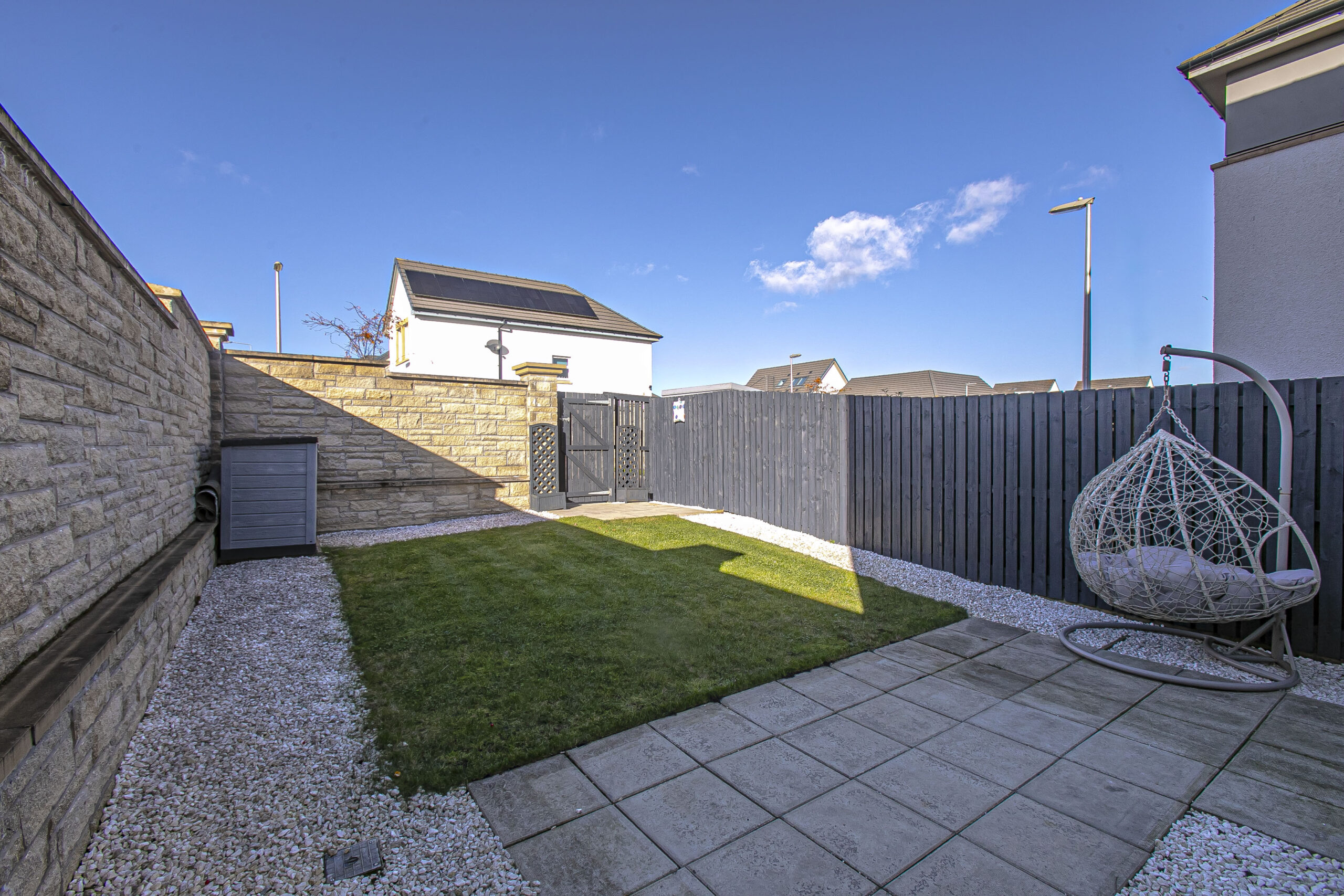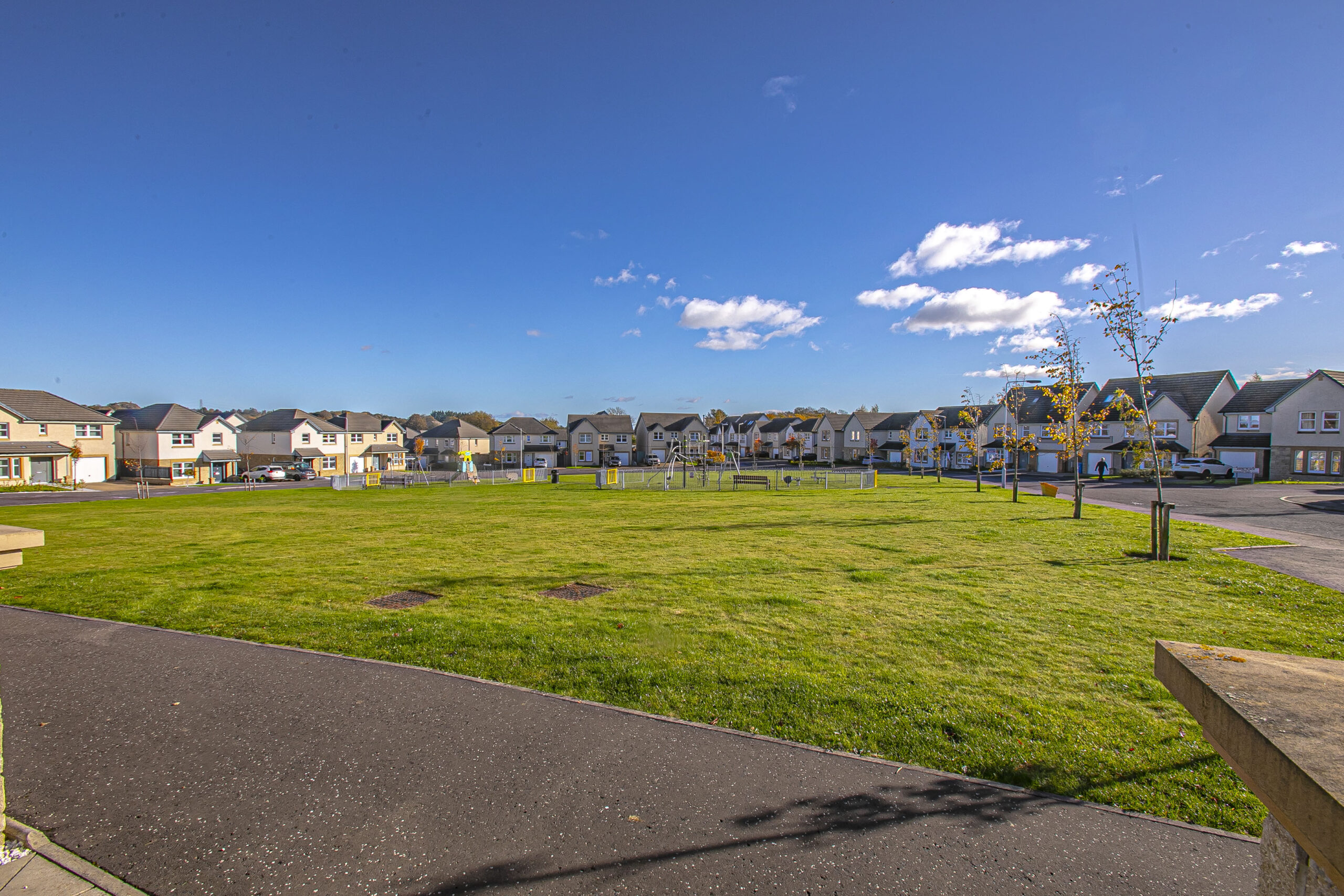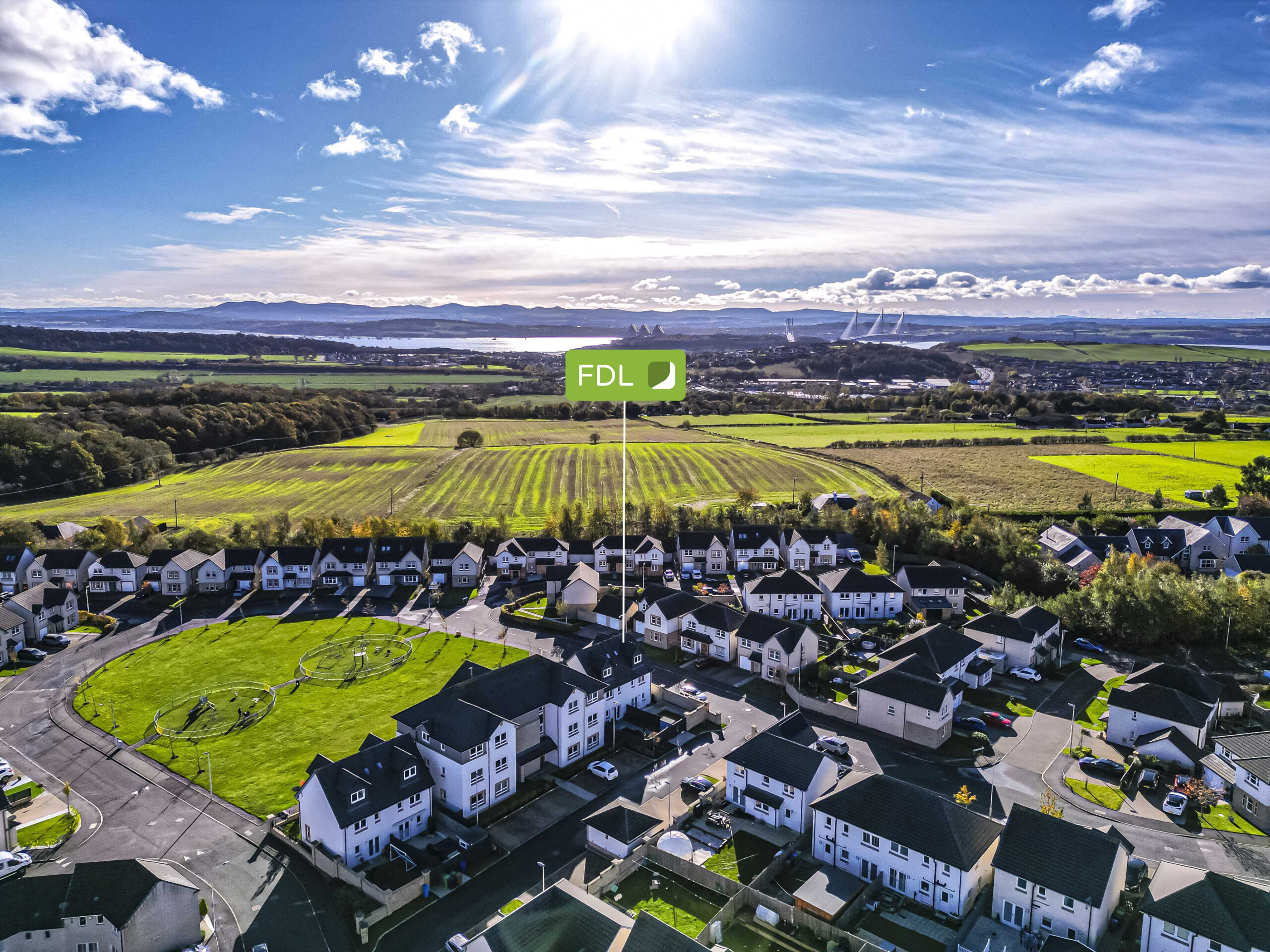 Internal spacious and welcoming accommodation is bright and airy and set over 3 generous floors. This is an Elliot-style family home which was built by Dundas Homes approximately 5 years ago and will impress the most discerning viewer. The ground floor level features a spacious, bright and airy lounge overlooking the front garden and commanding fabulous views across the estate greenbelt area. The modern dining kitchen enjoys French doors which open onto the private back garden and features an array of good quality units with integrated appliances and dining area with plenty space for free-standing dining furniture. The lower level of the house is completed with a handy modern WC /cloaks. Moving on to the first level, you will find 2 spacious double bedrooms with fitted wardrobes and plenty of floorspace for free-standing furniture. The level also features a lovely, modern family bathroom. The top level of this wonderful house features a fabulous large primary bedroom with fitted wardrobes, a recessed bay window area and a stunning, large and contemporary shower-room with large cubicle, beautiful tiling and overhead rainfall shower and handheld spray. As would be expected, this pristine family house benefits from gas central heating, uPVC double glazing and it also enjoys plenty of storage space. The landscaped, fenced and sunny back garden features a patio area and there is, of course, a gate to the rear parking area where you will find allocated and visitor parking spaces, as well as additional visitor parking. There is also a parking bay to the side. There is a small, attractive walled and fenced front garden which overlooks a beautiful, open greenbelt area.
