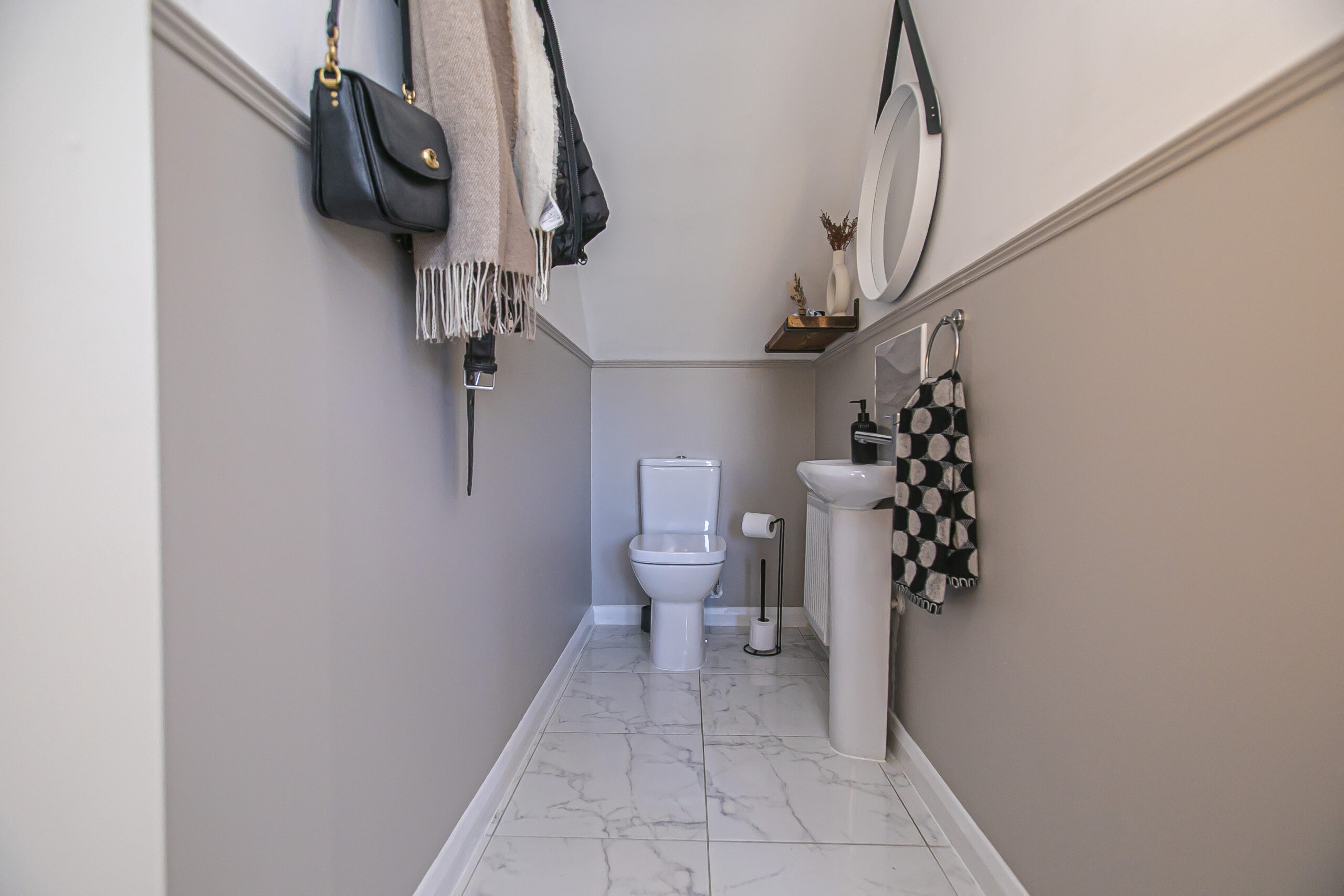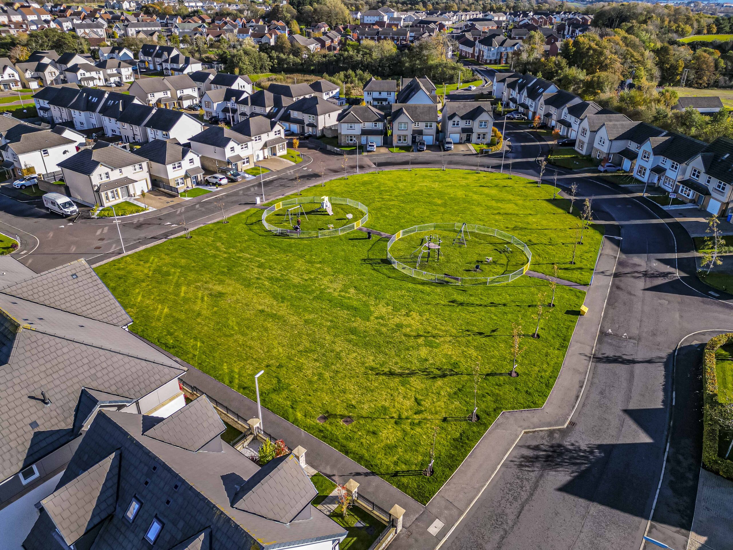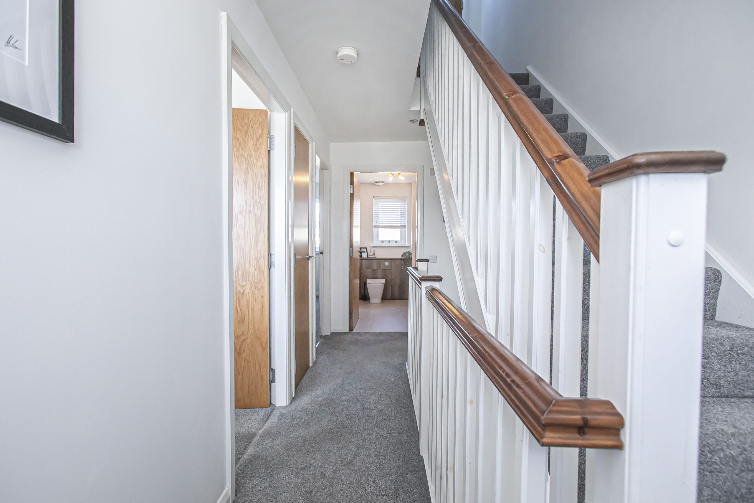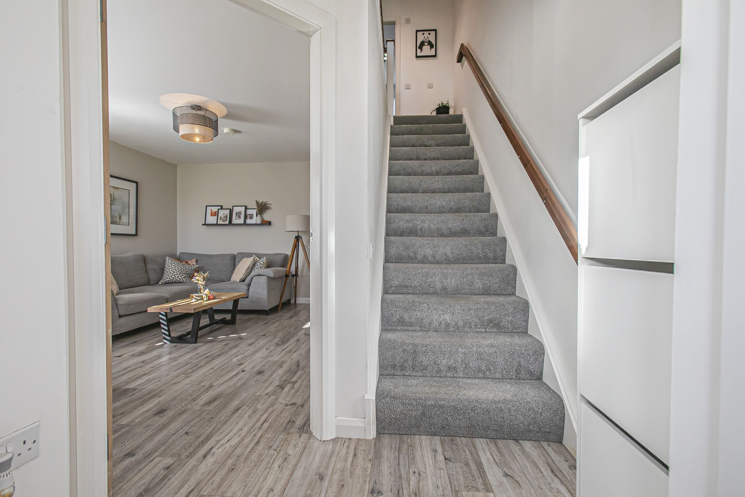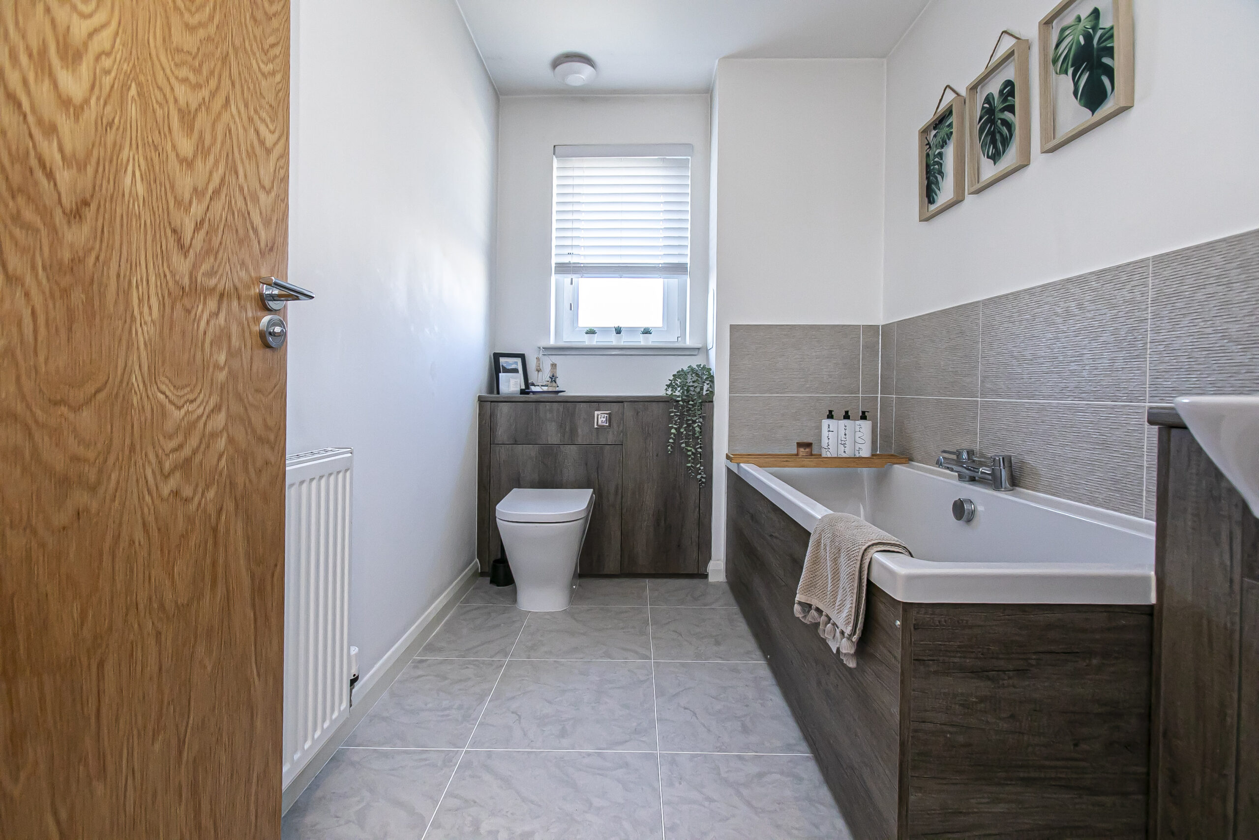 Internal spacious and welcoming accommodation is bright and airy and set over 3 generous floors. This is an Elliot-style family home which was built by Dundas Homes approximately 5 years ago and will impress the most discerning viewer. The ground floor level features a spacious, bright and airy lounge overlooking the front garden and commanding fabulous views across the estate greenbelt area. The modern dining kitchen enjoys French doors which open onto the private back garden and features an array of good quality units with integrated appliances and dining area with plenty space for free-standing dining furniture. The lower level of the house is completed with a handy modern WC /cloaks. Moving on to the first level, you will find 2 spacious double bedrooms with fitted wardrobes and plenty of floorspace for free-standing furniture. The level also features a lovely, modern family bathroom. The top level of this wonderful house features a fabulous large primary bedroom with fitted wardrobes, a recessed bay window area and a stunning, large and contemporary shower-room with large cubicle, beautiful tiling and overhead rainfall shower and handheld spray. As would be expected, this pristine family house benefits from gas central heating, uPVC double glazing and it also enjoys plenty of storage space. The landscaped, fenced and sunny back garden features a patio area and there is, of course, a gate to the rear parking area where you will find allocated and visitor parking spaces, as well as additional visitor parking. There is also a parking bay to the side. There is a small, attractive walled and fenced front garden which overlooks a beautiful, open greenbelt area.
