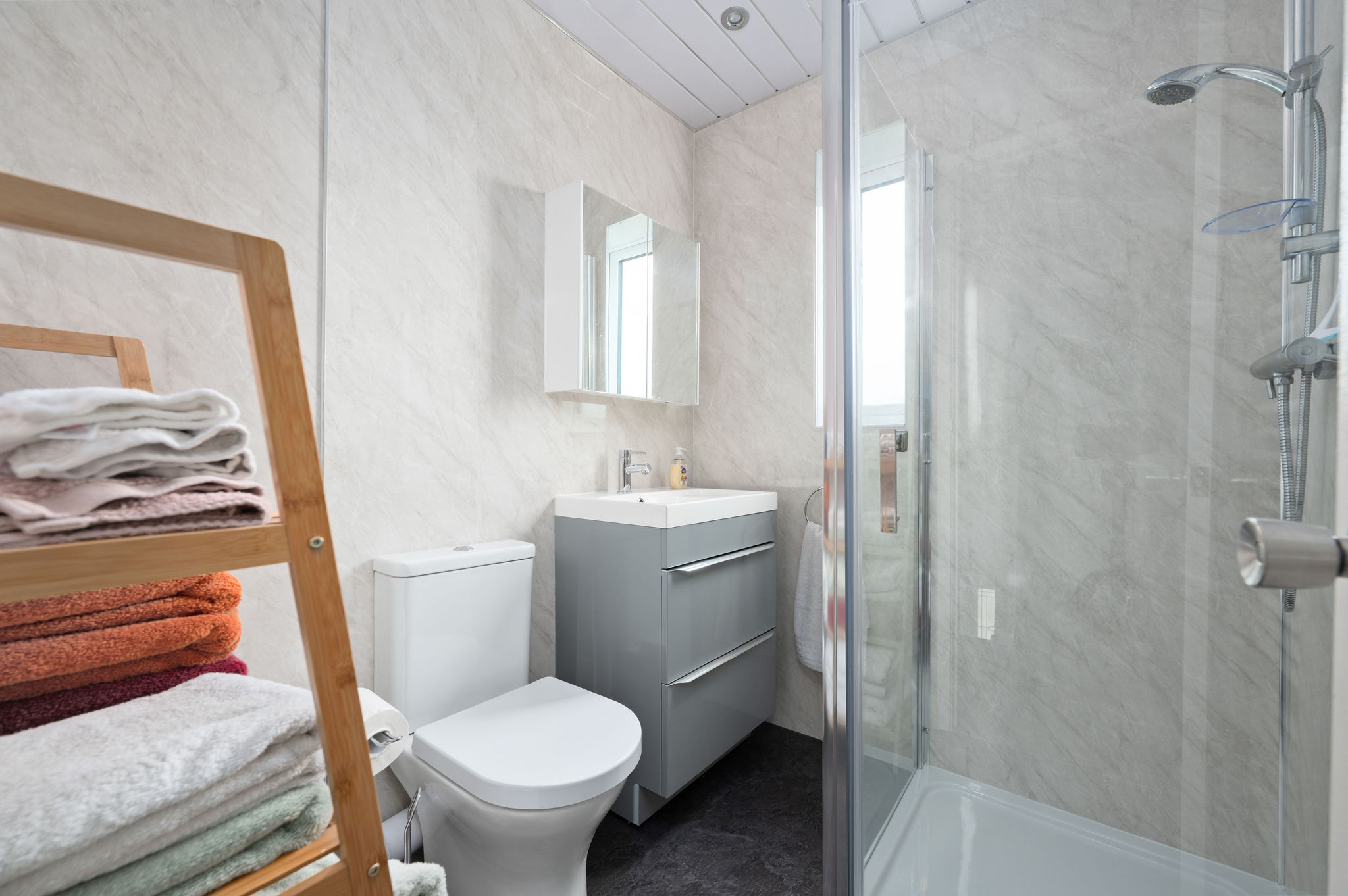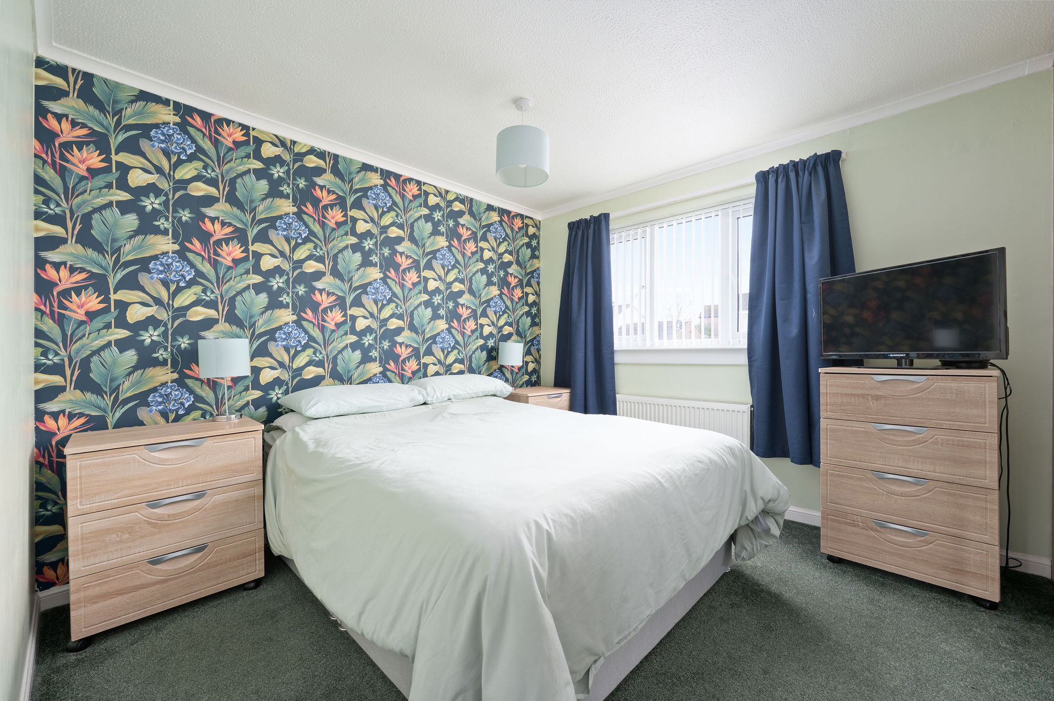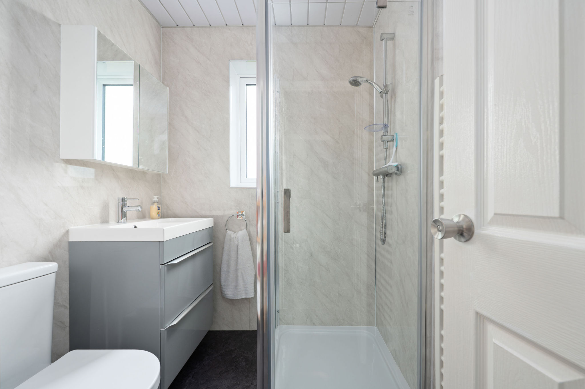 Upstairs, there are 2 generous double bedrooms, with the primary bedroom benefiting from built‑in storage, along with a stylish modern shower-room finished with contemporary wet‑wall panelling.